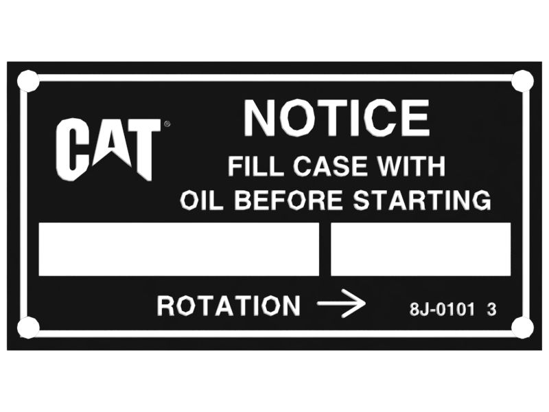 Plăcuță Cat® cu instrucțiuni pentru umplere cu ulei (Notificare), Dimensiunea plăcii: 83 x 45 mm, Montare pe pompa hidraulică cu șuruburi de antrenare #4 (nu sunt incluse)